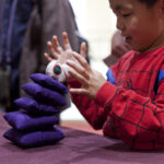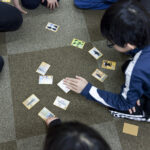 ミニ縁日では投扇興、ピースガン、小座布団積み、かるたの四種類のゲームを設け、挑戦すると謎解きシートにある四つの問いのヒントがもらえる仕組みにしました。すべての謎が解けて答えがわかったら採点ブースへ景品獲得となるだけに、素直で想像力たくましい、当公演ご来場の子どもたちはほぼすべての子どもたちがこのゲームを楽しんでくれたようでした。